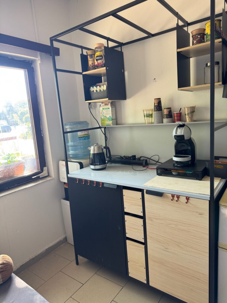 Myslíme ale i na majitele – víme, že si každý rád na chvíli „odfrkne“. K dispozici je proto malé, útulné zázemí s kuchyňkou a posezením, ideální pro odpočinek nebo příjemné chvíle po práci se svými koňmi.